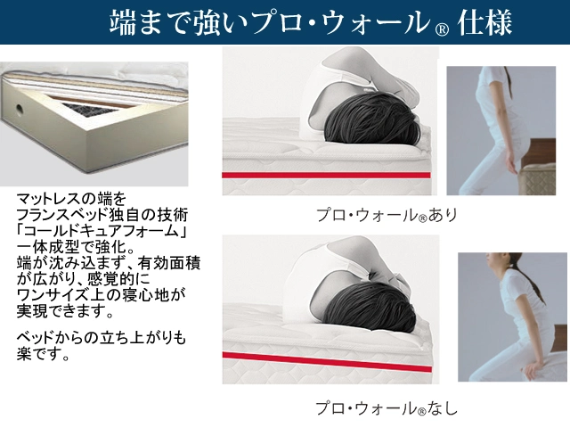 マットレスの端をフランスベッド独自の「コールドキュアフォーム」一体成型で強化。端が沈み込まず、有効面積が広がることで、ワンサイズ上の寝心地の実感できます。また、マットレス2台を並べて使う際も、つぎ目をしっかり支えます。端がしっかりしていることによって安定感もあり、ベッドからの立ち上がりも非常に楽になります。