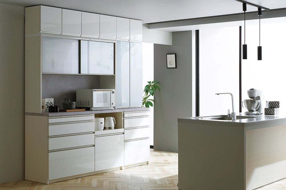 カラーは美しい光沢感のあるパールホワイト。バックボードやカウンター天板は人気の石目柄。スタイリッシュなツートンカラーに仕上げました。