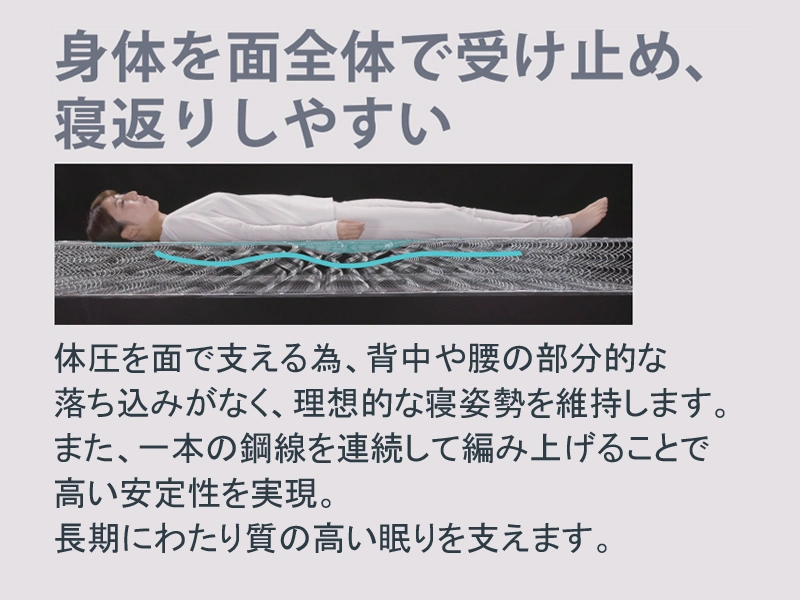 体圧を面で支える為、背中や腰の部分的な落ち込みがなく、理想的な寝姿勢を維持します。