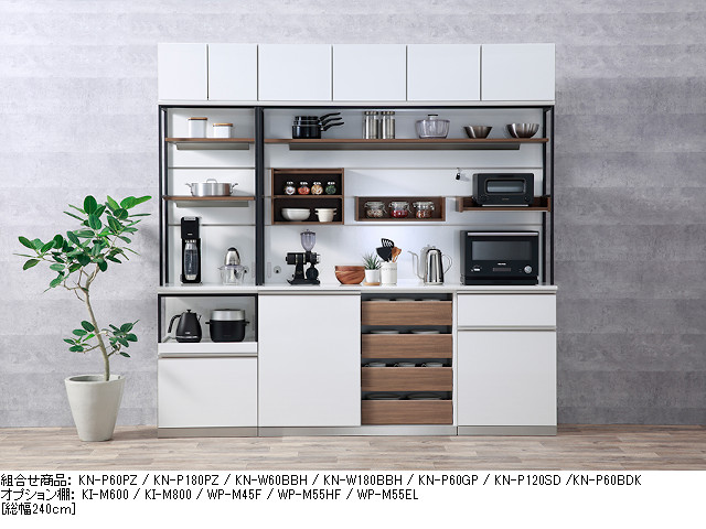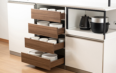 目線の高さにある扉収納や側板を排することで、従来の食器棚にありがちな圧迫感を抑えたキッチン収納の新しいカタチ。