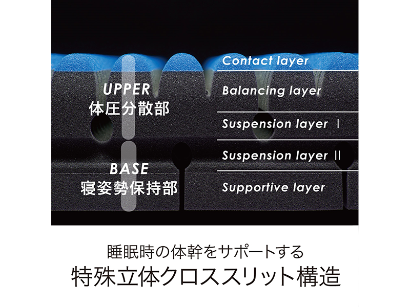 UPPER(上層部)の凸凹で体圧を分散。BASE(ベース部)でしっかり全身を支え、バランスのよい寝姿勢を保持します。