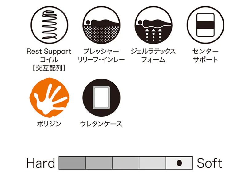 クッション層:化繊綿、スーパーソフトウレタン、プロファイルウレタン、抗菌不織布、高密度スーパーソフトウレタン、 5ゾーン・プレッシャーリリーフ・インレー、中マチ用生地、ウレタン、ウレタン+硬質フェルト(センターサポート)、ニューハードフェルト