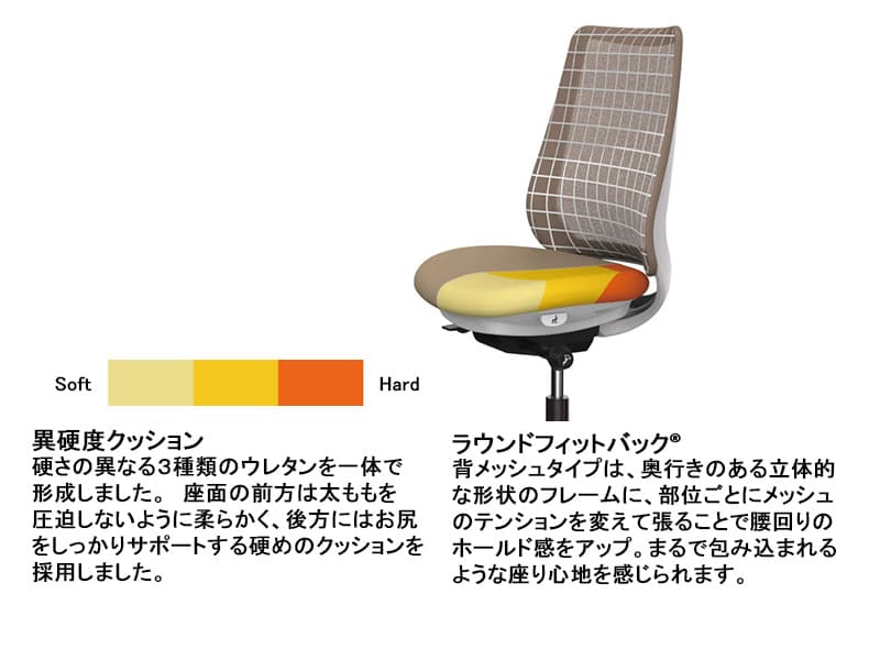 背メッシュタイプは奥行のある立体的な形状のフレームに部位ごとにメッシュのテンションを変えて張ることで腰回りのホールド感をアップ。まるで包み込まれるような座り心地を感じられます。