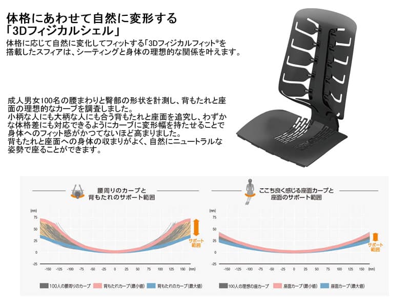 体格に応じて自然に変化してフィットする「3Dフィジカルフィットシェル」を搭載したスフィアはシーティングと身体の理想的な関係を叶えます。