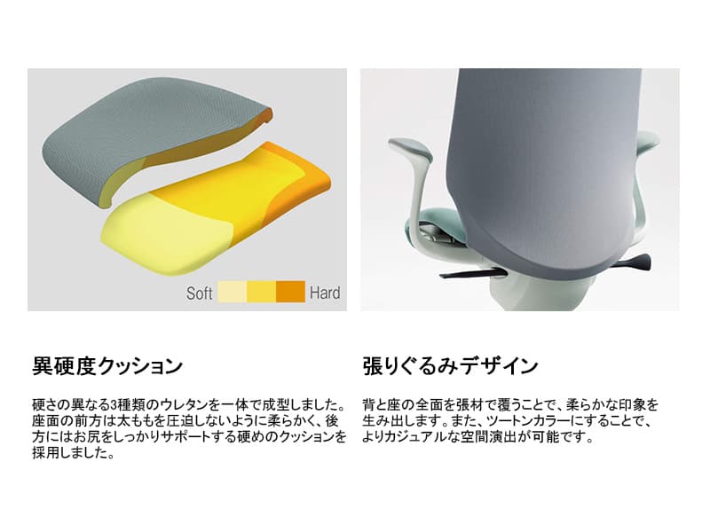 座面の前方は太ももを圧迫しないように柔らかく、後方にはお尻をしっかりサポートする硬めのクッションを採用しました。