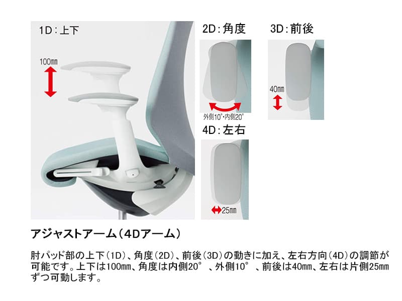 肘パッド部の上下(1D)、角度(2D)、前後(3D)の動きに加え、左右方向(4D)の調節が可能です。