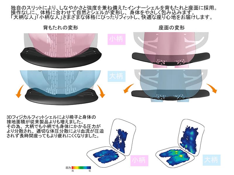 オカムラ独自の技術により、座る人の体格に合わせて背もたれと座面が身体を包み込むように変形し、自然と身体にフィットします。