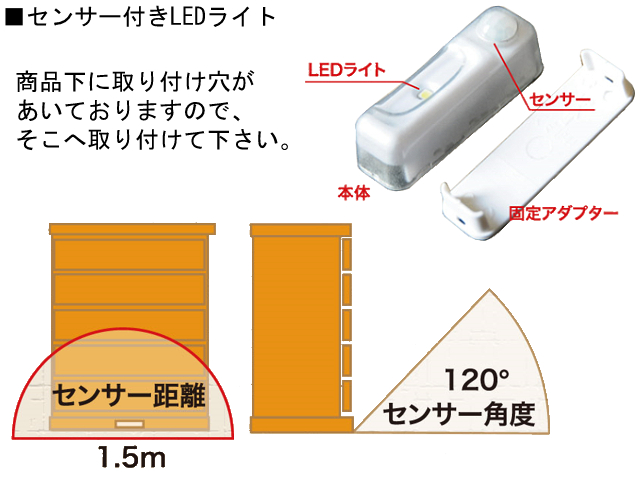 ・センサー付きLEDライト:足元にはセンサー付きLEDライトが付いています。着脱可能なので、懐中電灯(電池式)としても使用可能です。