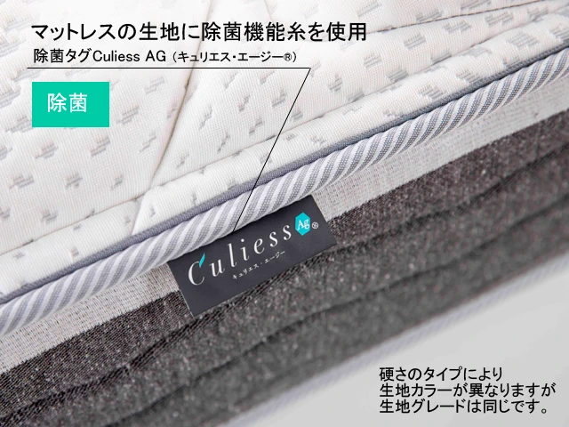 銀イオンの+電子が、微生物(細菌)外側のマイナス電子の細胞膜に作用することで、細胞膜を破壊します。さらに銀イオンによる除菌機能は繊維自体が有しているため、除菌機能糸「アグリーザ®」の銀イオンの力で、マットレス生地をいつも清潔に保ちます。悪臭などの原因となるさまざまな細菌への効果も実証されています。