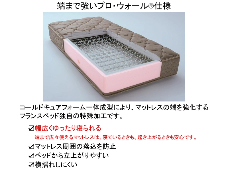 フランスベッド独自の高密度連続スプリング®を採用したプロ・ウォール®仕様のマットレスです。