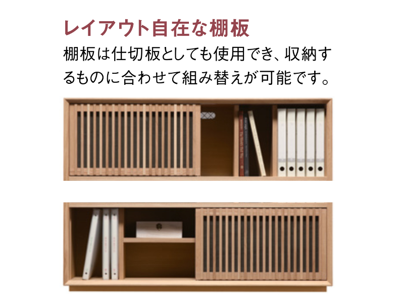 一本一本丁寧に組み上げた、スリットデザインの引き戸。自在にカスタマイズできる棚板で自分仕様収納。