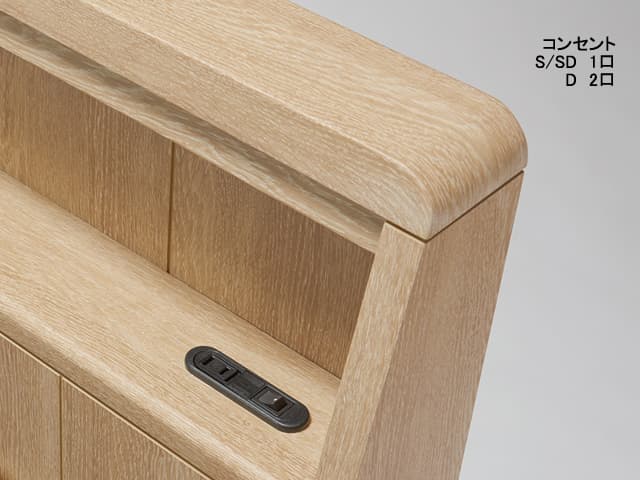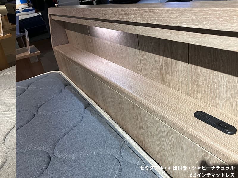 小物を置ける棚やモバイル充電のコンセントなど実用性を重視したキャビネットタイプのベッドフレーム・マットレスセット。
