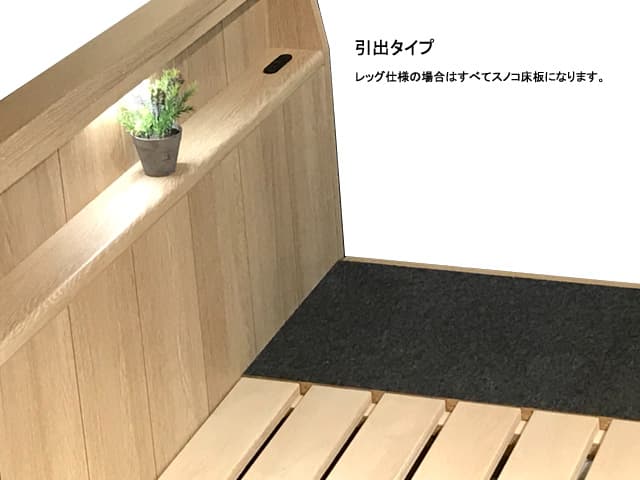 ボトムタイプは引出収納の他、お掃除がしやすいレッグ、マットレスの耐久性と寝心地を向上させるダブルクッションの3タイプを同価格でご用意。