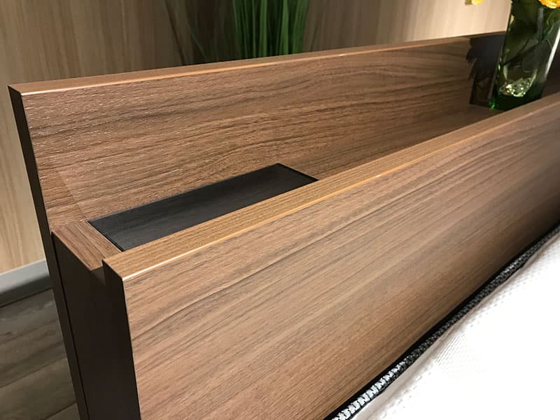 和にもモダンにも適したヘッドボードのデザイン。スマートフォンなどを置ける天面は淡く照明が灯ります。