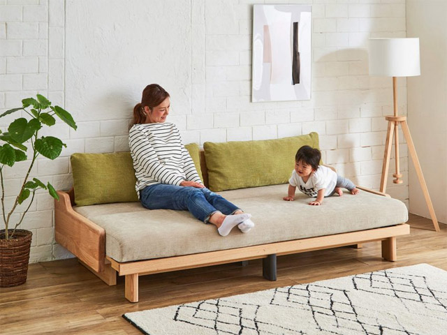 人気ブランドのカリモク家具のこだわりのデザインで人気のソファです。お昼寝もしやすいように肘掛の高さを低めに抑えるなど機能面も配慮されていて、前後方向にはお掃除ロボットも通れるようになっています。