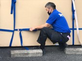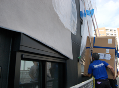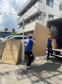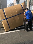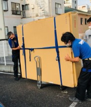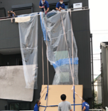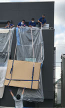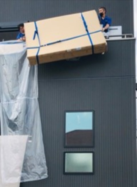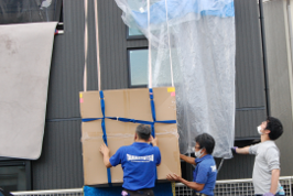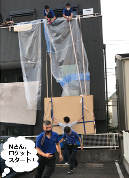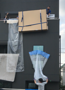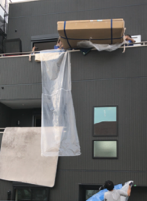 ベッドや電動ソファの大物3点が玄関からの搬入が困難なため、>今回、吊るし上げによって搬入するとのこと。