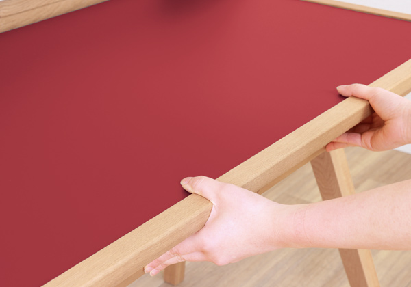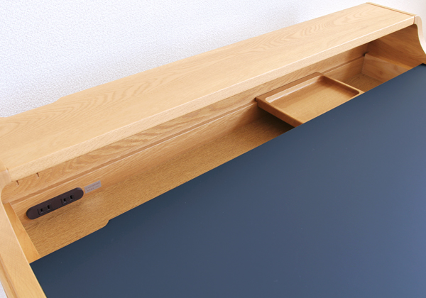 ブルーやレッドのお部屋のアクセントにもなるカラー天板をスライドさせると出てくる隠し収納スペース!お洒落なペントレーで散らかりがちな筆記用具をスッキリ片付けることも!