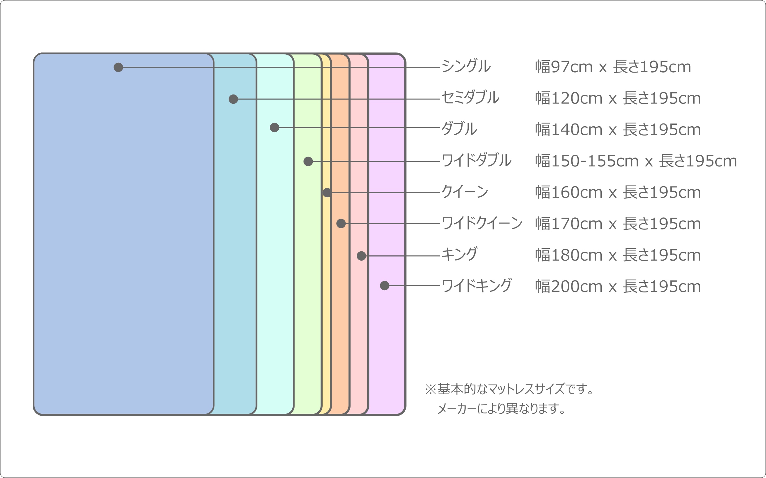 基本的なマットレスのサイズは上記の通りですが、その大きさはベッドメーカー、マットレスメーカーにより異なります。